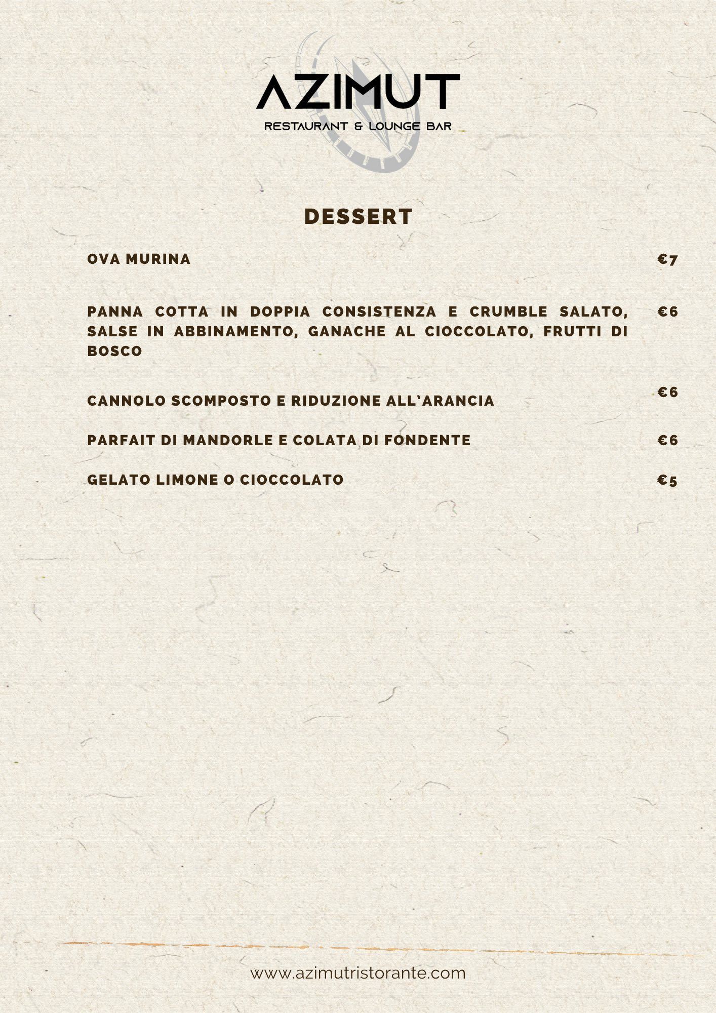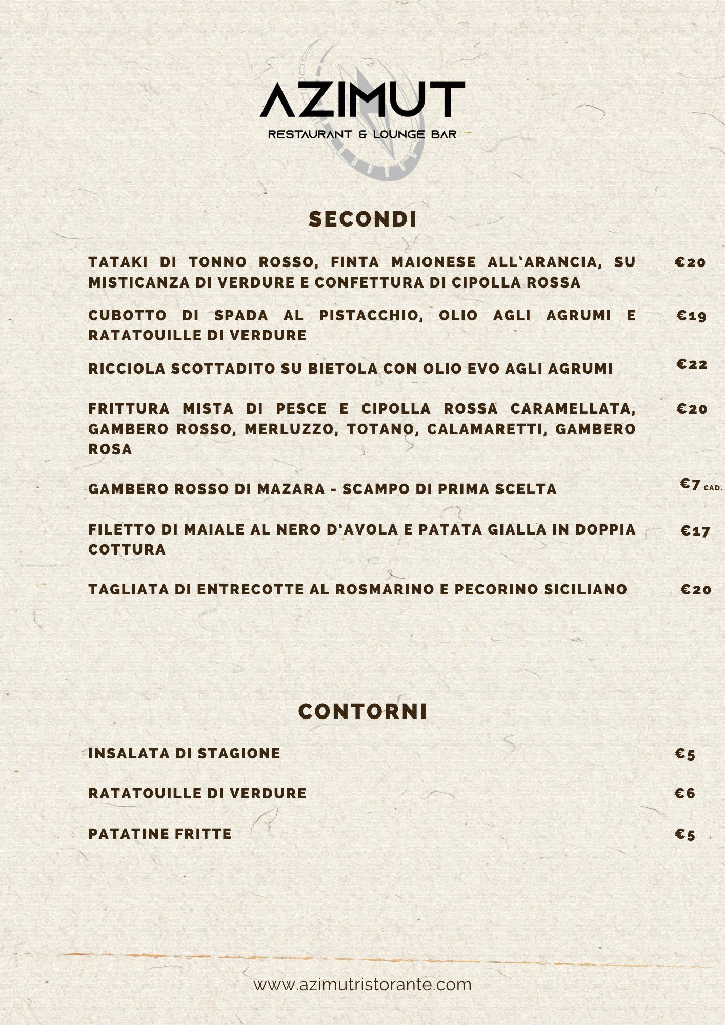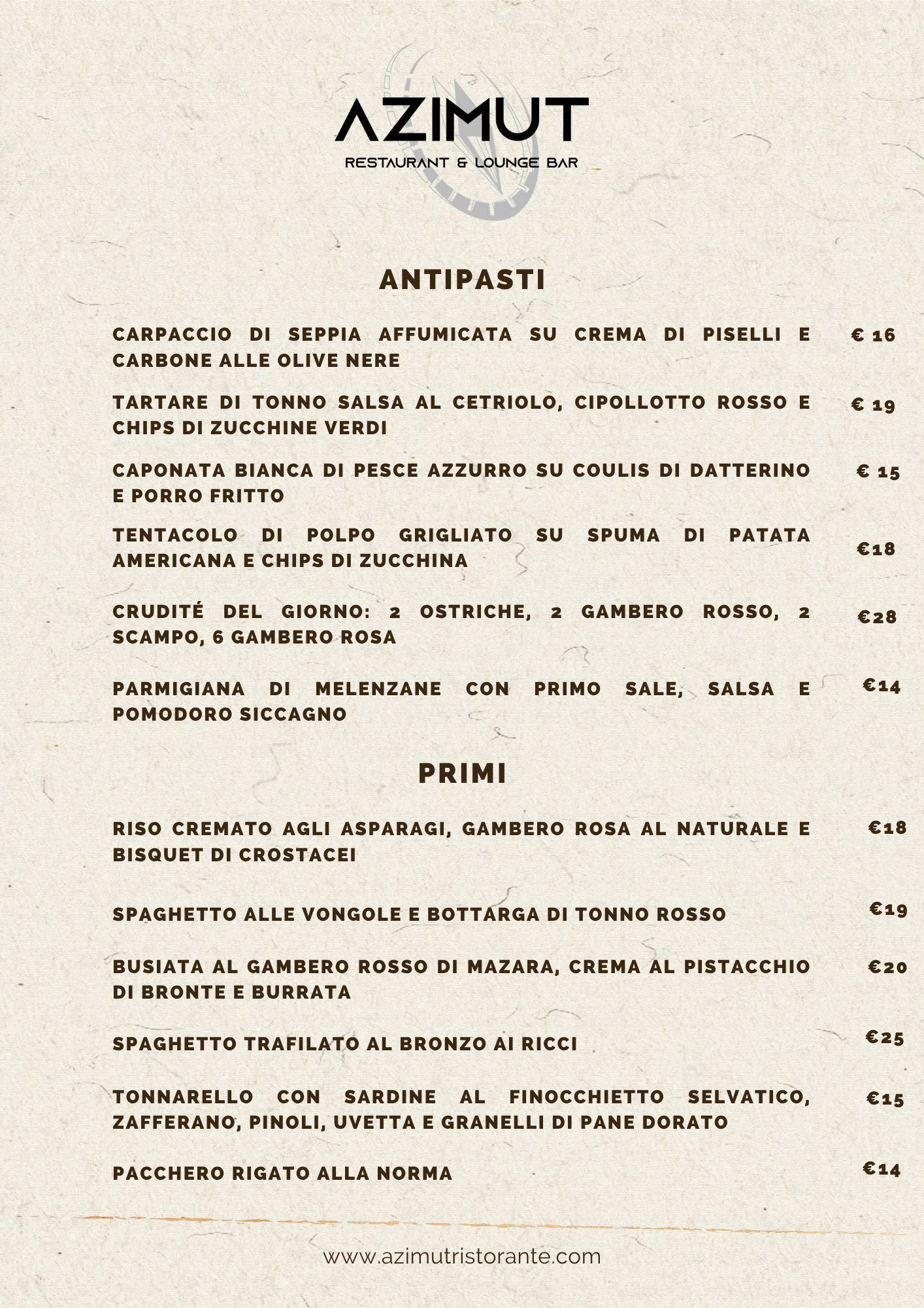 Nel nostro menù si riflette l’anima di Azimut: una cucina che parla del mare, della terra e delle eccellenze del territorio siciliano. Ogni piatto è il frutto di una ricerca attenta, di materie prime selezionate con cura e di una visione culinaria che unisce tradizione mediterranea e interpretazione contemporanea.